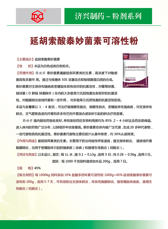 产品描述:延胡索酸泰妙菌素可溶性粉 【主要成分】延胡索酸泰妙菌素 【性 状】本品为白色或类白色粉末。 【作用于用途】截短侧耳素类抗生素。主要用于防治鸡慢性呼吸道病, 猪支原体肺炎